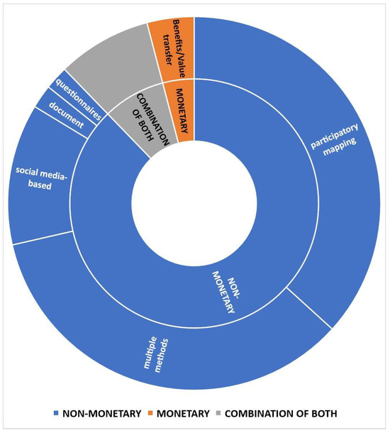 Next followed the classification of valuation methods into three general categories—monetary, non-monetary, or combination of both—as well as further sub-categories of methods based on the categorization of valuation methods presented by [51] (see Table 3).
