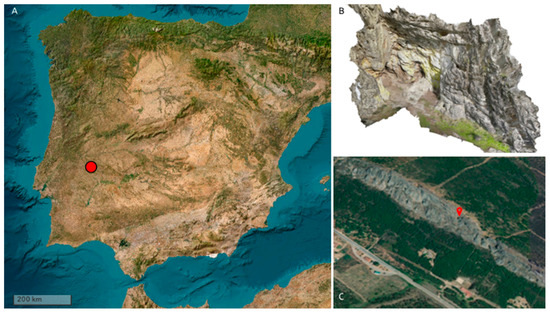 Figure 1. (A) Localization of Abrigo Puerto Roque (Valencia de Alcántara, Cáceres, Spain); (B) 3D representation of the shelter; (C) elevated position on the rocky cliff.