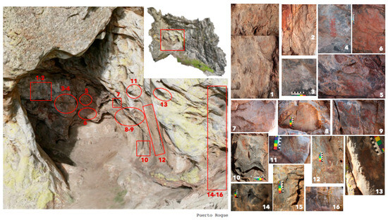 Sixteen pigment samples (Lab Code: Puerto_1 to Puerto_16) were collected from specific figurative representations within the Puerto Roque rock art shelter, along with three samples of ochre sourced from the shelter’s soil (samples Puerto_17, Puerto_18 and Puerto_19).
