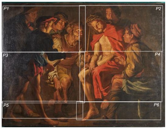 Visible light image of the Mocking of Christ by Matthias Stomer, in the permanent collection of Museo Civico, Castello Ursino, in Catania, Italy; rectangles and labels P1–P6 show the different areas scanned with the MA-XRF system.