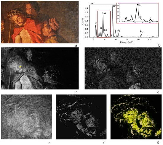 VIS-light image (a); XRF spectrum collected from an area of Christ’s cheek (b) from the yellow rectangle in (c) using the Cr-anode X-ray tube and comparison of Pb and Sb distribution maps for area P2 of the Mocking of Christ obtained with the Rh (c,d) or Cr (e,f) target; false-colour image created from the scatterplot of Pb vs. Sb (Figure S10), representing the areas where these elements correlate (g).