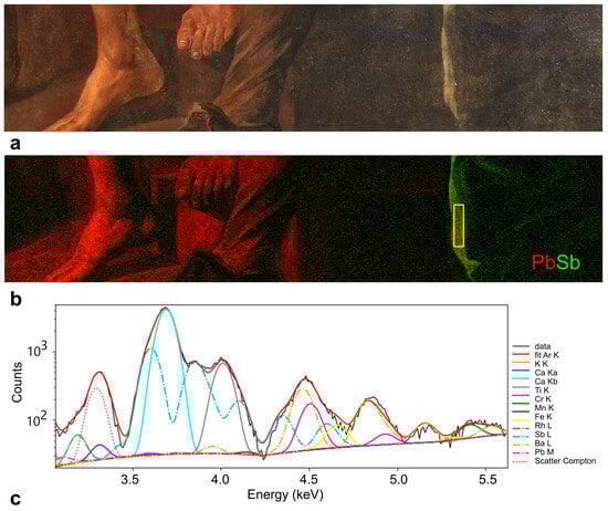 Area P6 of the Mocking of Christ, VIS-light image (a) and false-colour image with Pb distribution shown in red and Sb in green (b); deconvoluted contribution from each chemical element (c) in a region of interest (ROI, processed with PyMCA software), i.e., the yellow rectangle in (b) of the clothing.