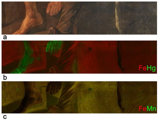 Sometimes, small red details seem to be painted with a different type of ochre, as observed in the shoelace of the right figure, where Mn is lower or absent, possibly suggesting the use of pure hematite (Figure 4c and Figure S3). In the same area of the painting, K does not seem to be linked to any organic pigment, as it does not show any correlation with aluminium, the major component detected by X-ray analysis for red lakes []. In fact, it may represent clay minerals within the brightest green earth used in the right figure’s cloths (Figure 5), being potassium distribution consistent with iron presence (see the mosaic maps of K and Fe in Figures S1 and S4, respectively).