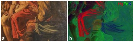 Area of acquisition P4, visible light (a) and false-colour RGB image (b) showing the distribution of mercury (red), iron (green) and potassium (blue).