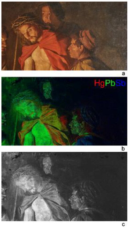 Christ’s face, visible light (a) and false-colour RGB image showing the distribution of mercury (red), lead (green) and antimony (blue) after MA-XRF with the Rh target (b); lead distribution is also shown alone in the grey map (c).