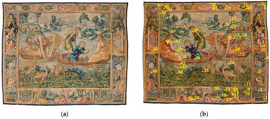 Miraculous Draught of Fishes (Figure 1) in the collection of the Indianapolis Museum of Art at Newfields is a large decorative wool hanging tapestry that measures 13.5 ft × 16.3 ft and was manufactured in the 17th century by the Flemish workshop of the Mattens family [1]. Of note, it bears both the monograms of the workshop (intertwined HM) and the city of creation (BB for Brussels-Brabant). Its design consists of a wide ornate border surrounding a large central panel depicting the biblical story of Jesus performing the miracle of the catch of fishes by four of his future disciples Simon Peter, Andrew, James, and John, as well as the father of the latter two, Zebedee, with combined elements from the Gospels of Luke 5: 1–11, Matthew 4: 18–22, and Mark 1: 16–20. The design of the central panel is based on the first of the set of ten drawings, known as the Acts of the Apostles, created by the renowned Italian artist Raphael between 1515 and 1516 [2,3,4,5]. These drawings, also referred to as cartoons, were commissioned by Pope Leo X to be translated into tapestries intended for decoration of the lower walls of the Sistine Chapel. The wall hangings were eventually manufactured by the Flemish tapissier Pieter van Aelst between 1520 and 1523 [2,3,4,5]. Today, the complete set of ten original tapestries is still in the collection of the Vatican Museums.