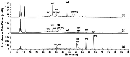 Consistent with published data [22,23,24,25,26,27], luteolin-7,3′-di-O-glucoside (W1), luteolin-7-O-glucoside (W2), and luteolin (W6) were the three predominating peaks in our data, although their relative ratios were variable between samples, with W1 usually being the smallest of the three. The remaining peaks, including those for apigenin-7-O-glucoside (W3), chrysoeriol-7-O-glucoside (W4), luteolin-3′-O-glucoside (W5), luteolin (W6), apigenin (W7), and chrysoeriol (W8), were smaller and variable in height, to the extent that in some instances W5 and W8 were not observed even by ion-extraction. Furthermore, the sum of peak height for the respective glycosides and aglycons maintained the expected ratio luteolin > apigenin >> chrysoeriol [28].