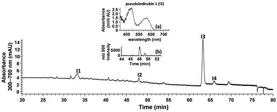 Chromatogram of the extract from blue yarn sample 46, likely dyed by woad, with characteristic dye components marked as in Table 2. Inset (a) shows the UV-vis spectrum of pseudoindirubin 1 (I2), while inset (b) shows a chromatogram for the extracted ion m/z 500 indicative of pseudoindirubin 1 (I2) and its putative isomer pseudoindirubin 2.