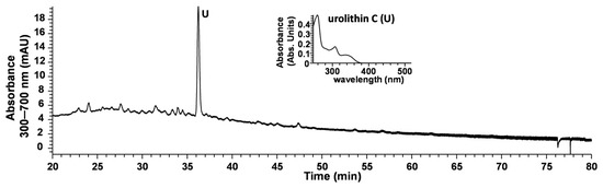 Chromatogram of the extract of tan yarn sample 39 showing the presence of urolithin C (U). Inset reveals UV-vis spectrum of urolithin C.