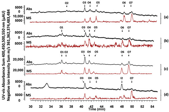 Data for the lichen dyed samples: (a) dark pink sample 9, (b) red sample 16, (c) pink sample 25, and (d) purple sample 46. The traces are based on absorption and corresponding ion extracted MS chromatograms as indicated.