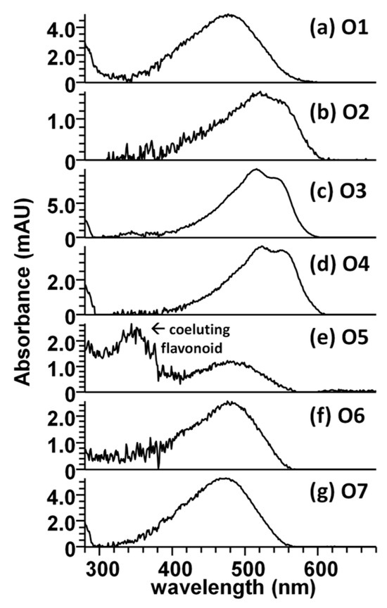 UV-vis spectra of the orceins O1–O7 detected in sample 25: (a) R.T. = 36.3 min, MW 375, an unknown hydroxyorcein; (b) R.T. = 37.0 min, MW 484, a β- or γ-aminoorcein; (c) R.T. = 40.7 min, MW 362, an α-aminoorcein; (d) R.T. = 41.6 min, MW 484, a β- or γ-aminoorcein; (e) R.T. = 42.5 min, MW 485, a β- or γ-hydroxyorcein; (f) R.T. = 48.1 min, MW 485, a β- or γ-hydroxyorcein; (g) R.T. = 49.4 min, MW 363, an α-hydroxyorcein.