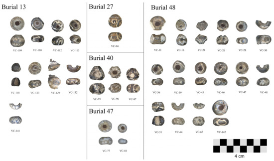 The sample set comprised thirty-one “black” and white polychrome beads (Figure 1) from five female burials, randomly chosen among over one hundred and forty black-appearing beads. Burials 13, 40, 47, 48 were anthropologically sexed as female, while burial 27 was identified as archaeologically female on the basis of grave goods and funerary attire, which is in conformation with the current understanding of Iron Age funerary practices in the Portuguese interior [34,46,50,65]. Because of their delicate state, sample preparation procedures were omitted for the majority of the samples. Fragments of three samples from (VC-24, VC-110, VC-129) were mounted in resin and hand polished on a silicon carbide paper to remove altered glass layers and cleaned with distilled water in an ultrasonic bath for 5 min to dislodge any contaminating particles. The polished samples served as a control for the potential effects of leaching and/or glass corrosion on the results of the non-polished samples.