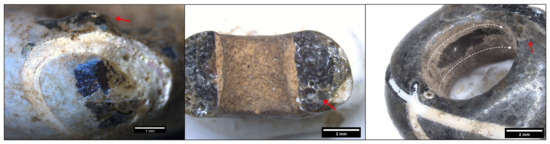 Optical microscopy of the beads revealed traces characteristic of wire-winding, including spherical bubbles in sections of fragmented beads (Figure 2 centre), asymmetric profiles (e.g., VC-48 in Figure 1), and glass trails around perforation edges (Figure 2, left). Bubbles in glass result from gasses being trapped in the solidifying melt and their shape can be indicative of the way glass was stretched during the working stage. Spherical bubbles in bead cross-section, therefore, evidence that the gather was wound around the mandrel, as opposed to elongated bubbles observable in drawn beads, or glass vessels [68,69]. A large discontinuity in the perforation wall, arising from an incomplete attachment of the viscous glass coils during winding [70], was also observed in sample VC-110 (Figure 2, right). Glass trails, another feature highly indicative of bead winding [70,71], were noted in several examples (Figure 2, left, right). The white decorations on the beads were applied on the viscous bead core, either by one or more continuous motions in the case of beads with waved line decorations and beads with a triple spiral motif (Figure 2, right), or by superimposing layers of white and black glass in the case of eye beads (VC-24, VC-94, VC95, VC-97, VC-129), with the exception of uneven white decoration on sample VC-30 which appears to have been made by directly drawing the eye motif with white glass in the bead body instead of layering different colours. In some cases (VC-95, VC-97), layers of white glass in the eye beads were not preserved, leading to the detachment of the superimposed layers of the eye decoration and lending the beads a triangular prismatic appearance. Based on the observed traces, all the analysed black-appearing beads can be classified as wire-wound beads, made by winding viscous glass around a mandrel, similar to modern-day lampworking, which is a well-documented technique on prehistoric glass beads [62,71,72,73,74].