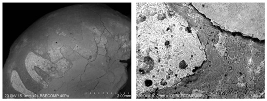 Macro- and microscopic evidence of degradation such as surface porosity, surface damage, fracturing, iridescence, and the formation of discoloured dealkalinised layers (Figure 3, left), was observed to some extent in all the studied beads. White glass decorations appear to be more susceptible to degradation than black glass and are completely absent in some beads (VC-95, VC-96). A surface layer of altered glass resulting from alkali leaching [75,76,77] was noted in practically all samples. The colour of this layer is highly variable among the beads and covers a range of colours ranging from white to blue-grey, hindering accurate description of the true hue of black-appearing glass. Altered layers are extremely brittle and detached easily during handling, which, in conjunction with the characteristic typology of the samples, allowed for their identification as black, or black-appearing beads since in many cases it exposed the underlying glass bulk. VP-SEM-EDS observations of the beads further highlighted the extent of degradation (Figure 3). The surface of the beads is covered by a silica-rich, dealkalinised layer covering both the black-appearing and white glasses, which occasionally made the identification of glass colours by VP-SEM-EDS challenging because of the lack of contrast. In the areas where this surface layer is detached, different colours of glass were easily identified due to the high BSE contrast arising from the presence of opacifier crystals in the white glass. These exposed areas are marked by an irregular texture with a reticulate network of ridges, cracks, especially on the borders of different glass colours, and collapsed bubbles, often filled with organic detritus (Figure 3, right).