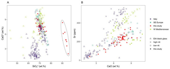 (A) CaO*/SiO2* biplot showing the differences and similarities in the lime content of black-appearing beads from Vinha das Caliças 4 (this study, LA-ICP-MS data) and comparative Iron Age glass from various assemblages. Leaching in samples VC-16w, VC-26w, VC-28w, VC-77w, VC-109w, VC-110w and VC-141w (dashed ellipse) results in relative enrichment of SiO2*. (B) Sr/CaO biplot demonstrating different lime sources for black-appearing beads from Vinha das Caliças 4 (this study, LA-ICP-MS data) and comparative Iron Age glass from various assemblages. CaO*, SiO2*—values normalized to the sum of 8 oxides (Na2O, MgO, Al2O3, SiO2, K2O, CaO, TiO2, FeO). Explanation of comparative dataset: Italy—natron and black glass beads from Sarno, Cumae, and Capua [22], black glass beads from Bologna, Pozzuoli and Cumae [14], natron and black glass beads from Francavilla Marittima, Torre Galli and Amendolara [84], Mediterranean Group I, II, III vessels from Adria [13], Mediterranean Group II vessels from Satricum [20]; SE Europe—low-Al natron glass beads from Una River Valley and Sanski Most (Bosnia and Herzegovina), Turska Kosa, Istria, Kompolje, Smiljan, Ljubač and Pannonia (Croatia) [62]; W Mediterranean—black glass beads from Carthage (Tunisia) [80], Levantine natron glass beads from Vinha das Calicas 4 [35], natron glass from Son Mas (Mallorca, Spain) [12]; EIA black glass—soda-lime-silica samples reported as black glass [14,22,80]; high-Al—Al2O3 > 1.5 wt. %.; low-Al—Al2O3 < 1.5 wt. %.