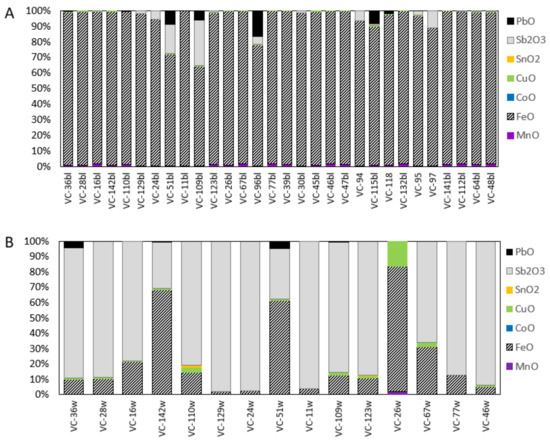 Thirty black-appearing glass samples can be characterised as Fe-coloured black-appearing glass since they feature heightened FeO concentrations (2.21–7.58 wt. %) relative to other colourants (Figure 7A). Notable amounts of Sb2O3 were detected in samples VC-24bl, VC-30bl, VC51bl, VC-94bl, VC-95bl, VC-96bl, VC-97bl, VC-129bl, and of PbO in samples VC-51bl, VC-95bl, VC-109bl, VC-115bl, VC-118bl and VC-129bl. One of the beads identified as a black-appearing bead during the visual examination, VC-81, is better characterised as Cu-Co blue, containing 0.68 wt. % CuO and 0.04 wt. % CoO, as well as low FeO (0.48 wt. %). Coupled with low Al2O3 content, the composition of sample VC-81 is drastically different from previously studied blue beads of Levantine origin from the site [35], indicating both a different glassmaking recipe and colouring technology employed in its production.
