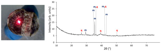 The analysed spot and the diffractogram of sample VC-67bl with identified crystalline phases: (m) magnetite, (q) quartz.