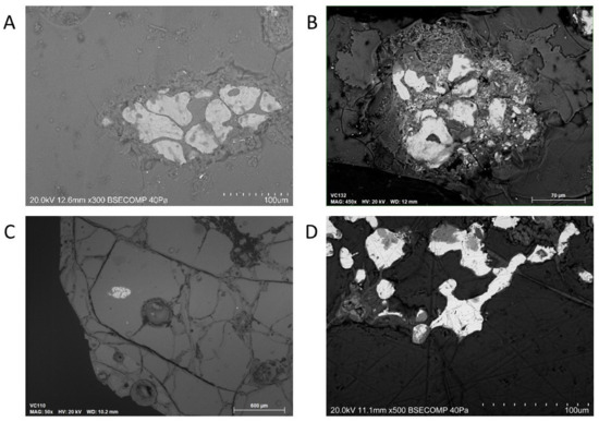 The results of mineralogical and textural analysis of the black-appearing glass offer additional evidence for the intentional use of iron-based colourants. Analysis by μ-XRD revealed a single case of magnetite (Fe3O4) in the sample VC-67bl (Figure 8, Table S3—Supplementary Information), most likely corresponding to the iron inclusion observed by VP-SEM-EDS in the same sample (Figure 9A). Virtually identical inclusions of dendritic iron oxide were observed in the black-appearing samples VC-110bl, VC-129bl, and VC132bl, (Figure 9). EDS analysis of these inclusions showed they are composed of iron oxide. Their composition and morphology match the iron inclusions observed in black glass beads from the Tophet in Carthage (Tunisia) which have been interpreted as magnetite in the form of iron slags added to imported glass to produce the characteristic black colour [80]. Similar technology was likely employed to obtain the black-appearing colouration of the beads from Vinah das Caliças 4.