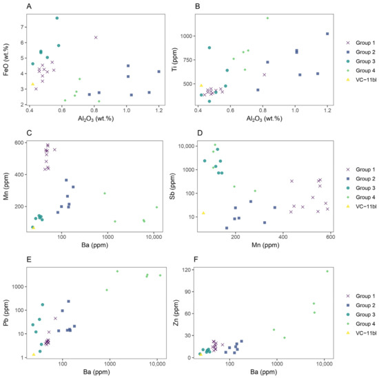 Biplots showing element associations in different black colourant groups from Vinha das Caliças 4. (A) FeO/Al2O3 biplot; (B) FeO/Mn biplot; (C) Mn/Ba biplot; (D) Sb/Mn biplot; (E) Pb/Ba biplot; (F) Zn/Ba biplot.