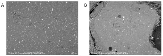 All samples were imaged in backscatter (BSE) mode with a Hitachi™ S3700N scanning electron microscope (Hitachi High-Technologies Corporation, Tokyo, Japan) in variable pressure (VP) mode. Elemental mapping and spectral data acquisition were performed using a QUANTAX EDS microanalysis system with a Bruker™ XFlash 630M EDS Detector® (Bruker Nano GmbH, Berlin, Germany). Analysis conditions for all samples included low vacuum (40 Pa), 20 kV accelerating voltage and a working distance of 9–13 mm. Spectral data were processed in Bruker™ ESPRIT compact software package (version 2.3.1.1019) using standardless quantification and the obtained compositions were calculated as normalised oxide wt. %.