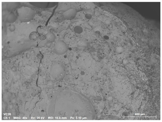 The white colour of the decorations was achieved predominantly by the addition of calcium antimonate acting as both colourant and opacifier, with Sb2O3 showing a wide range of values (1.4–10.6 wt. %) and corresponding to the relative amount of opacifiers observed in the glass texture (Figure 11). A single exception among the white decorations is sample VC-26w, in which the white appearance of the decoration was achieved by gaseous bubbles (Figure 12) in the glass matrix rather than the addition of antimonate opacifiers (<30 ppm Sb2O3). Unlike the black-appearing glass, different compositional groups cannot confidently be defined for the white glass due to the limited dataset and extensive leaching. Reproducible measurements by LA-ICP-MS were only obtained for thirteen white glass samples (VC-11w, VC-16w, VC-26w, VC-28w, VC-46w, VC-48w, VC-51w, VC-77w, VC-109w, VC-110w, VC-129w, VC-141w), and only five samples (VC-11w, VC-46w, VC-48w, VC-51w, VC-129w) were reasonably well preserved (Na2O > 14 wt. %).