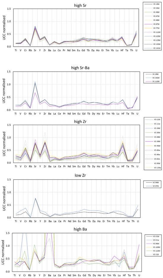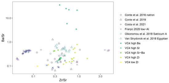 Regarding the nature of the network former, i.e., the use of high-purity sand or pure quartz, the heightened Zr content (29.1–334 ppm, avg. 138 ppm) of both black-appearing samples and white glass decorations could point to the use of sand, since Zr is often concentrated as zircon accessories in the heavy mineral fraction [81,85]. Similarly high Zr contents were detected in low-Al-high-Zr natron glass from SE Europe [62], and EIA (high-Zr) natron glass from Italy (FM4inc, AM1g, SN37t, SN35t, SN38t, NS32g, SN4t, SN7t, SN9g, SN3inc, SN33a, CA13inc) [22,84], with authors interpreting these values as indicative of the use sand [62], specifically of mature sands rich in quartz and zircon in the case of Italian samples [22,84], as opposed to pure quartz.