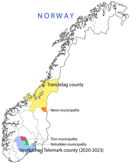 Location of Røros municipality (Trøndelag County) and Tinn and Notodden Municipality (Vestfold og Telemark County).