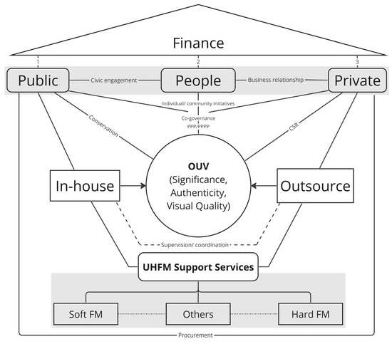 The UHFM organizational framework prioritizes heritage values as the central focus of urban heritage area conservation. Within the context of WH sites, the OUV serves as the foundation for inscribing cultural heritage on the WH list, making its preservation and care of utmost importance. The OUV, as the “core business” of the WH site, should not be compromised for the sake of efficiency, budget, or effectiveness as traditionally understood in facility management, including Urban FM. Urban-scale support services must be dedicated to ensuring that urban heritage areas, as a component of the built environment in FM defined by ISO41001 [17], continue to uphold their heritage significance, authenticity, and esthetic quality. The delivery of support services, both in terms of soft FM and hard FM (see Appendix A), by in-house teams and outsourced service providers should be rooted in heritage values and attributes that carry those values.