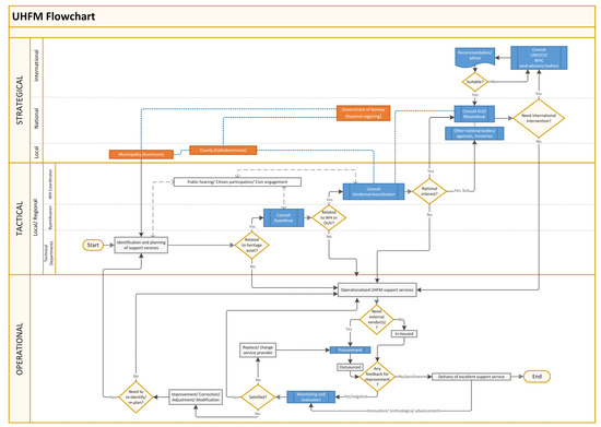 While the identification and planning of urban-scale support services originate at the municipal level, the strategic level in Norwegian WH practice also involves coordination functions with the county level (fylkeskommune) and the national level through KLD and Riksantikvar. Additionally, several national bodies, agencies, and ministries outside of KLD, including those responsible for railways, education, energy, health, and more, may participate in the coordination hierarchy. Once agreements on the provision of urban-scale support services are reached at the strategic and tactical levels, UHFM support services operationalize at the operational level, considering available resources and potential obstacles. Some support services are performed in-house, while others are outsourced to businesses, professionals, contractors, vendors, and private service providers through a procurement process. During the operationalization of support services, feedback for improvement is typically received from the operational level task forces as the avant-garde team and citizens as end users. This feedback mechanism involves various formal and informal procedures. The absence of feedback may indicate inadequacies in the delivery of support services. Enhancing the process of delivering urban-scale support services in an urban heritage area, particularly within the context of World Heritage Sites, requires continuous stakeholder engagement.