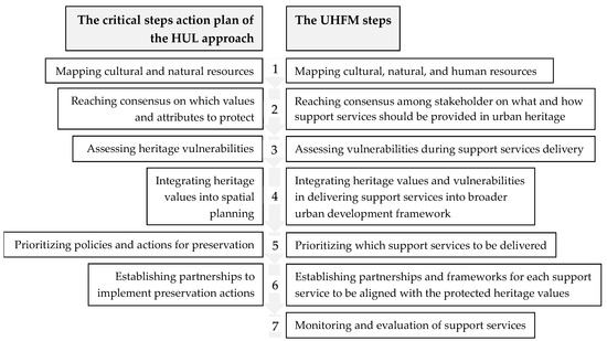 UHFM focuses specifically on examining the complex aspects of managing facilities in the context of urban heritage. It acknowledges that the preservation of OUV is not an isolated task but one that requires a coordinated effort in managing various support services crucial for the daily operation of these areas. Thus, UHFM bridges the gap between preserving cultural heritage, ensuring urban functionality, and promoting collaboration among stakeholders. It offers a detailed and practical framework for effectively organizing support services on a large scale in urban areas. Implementing UHFM into the management of historic towns has the potential to complement the conventional conservation measures undertaken by conservators and heritage authorities at various levels, nationally, regionally, and locally. This integration may deliver urban-scale support services that are in compliance with the preservation of OUV as part of the holistic approach recommended by UNESCO through the HUL approach [9,21].