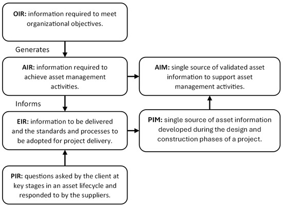 In adopting a BIM approach for heritage asset management, the overall goal is to develop a digital Asset Information Model (AIM) that offers a single source of validated data to support asset management activities. The data and information that go into an AIM should be informed by Organization Information Requirements (OIRs) in relation to the organizational objective and Asset Information Requirements (AIRs) in relation to the operation of an asset. Figure 1 provides guidance on the information requirements and the information models with Exchange Information Requirements (EIRs), Project Information Requirements (PIRs), and the Project Information Model (PIM).