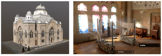 It has to be mentioned that in most situations, for a high-quality model, a combination of laser scanning and photogrammetry is used. Figure 3 showcases the digitalization [19] of the biggest synagogue in Slovakia, the Synagogue in Lucenec. For this project, the processing was done in two steps: (i) the laser scans were aligned, and (ii) images were added. The generated mesh was divided into parts, and each part was decimated to a maximum of 30 million polygons. For the reconstruction of small details, such as chandeliers, glass cabinets, and windows, manual retopology was used.