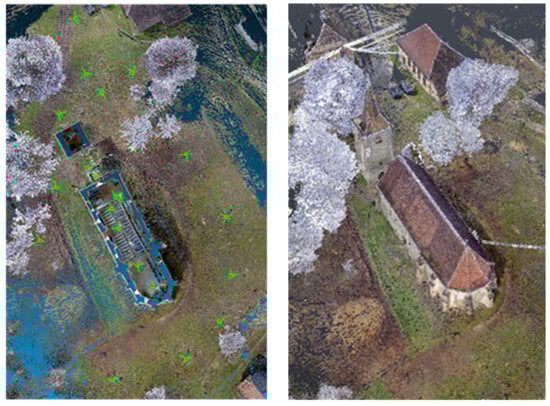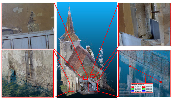 A total of 22 stations with forty-two georeferencing targets (for a minimum of three targets per scanning station) were considered inside and outside the church. The total count of points within the registered cloud was north of 618 million, with a total file size of 20.72 GB. It must be mentioned that such files are not manageable by usual BIM authoring tools nor by local authorities.