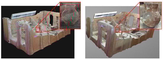 Figure 9 shows the point cloud and the subsequent mesh created for visualization with a detail, for comparison.
