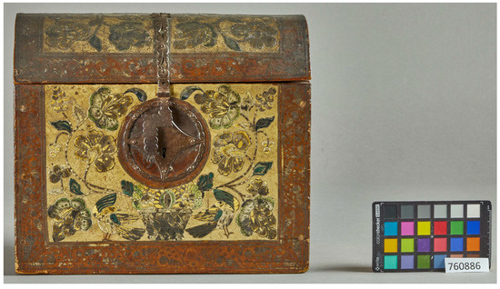 The Schedule is the earliest documentary record of the casket at Bateman’s and—describing it as Spanish—may have influenced the way the casket has been considered and catalogued in subsequent years. National Trust guidebooks of 1976, 1983, 1985, 1989, 1995 and 1996 incorrectly describe it as ‘a coloured gessoed box’, neither attributing it to a particular country of origin, nor hazarding a guess at the date when it was made [5,6,7,8,9]. The National Trust’s Collections Management System until recently described the casket as ‘lacquered’, not gessoed, but also declined both to date it or to attribute it to a particular school or country.
