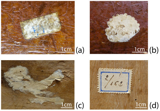 At the bottom of the casket, it is possible to distinguish three furniture beetle holes, two of them filled. It is significant that many other insect holes on the casket do not show any sign of past filling, suggesting that there were at least two, if not more, occurrences of pest attack. Thus, we can imagine that when the wood was first attacked by furniture beetles, it was treated with an aqueous solution of copper salts (Figure 23). The treatment was applied to the whole surface and particularly to where the three holes had appeared, so that the liquid penetrated the wood following the wood grain. This can be seen in the copper distribution map. Then, the holes were covered during the decorative process. Copper salts have been used as biocides since antiquity [37]. It is an attractive hypothesis to correlate the presence of copper with the silver corrosion phenomenon.