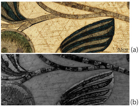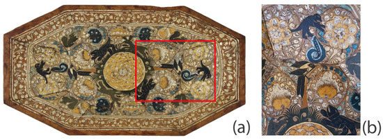 Detail of the front of the casket, showing an example of silver leaf applied in a mosaic fashion: (a) visible image and (b) infrared reflectography image.