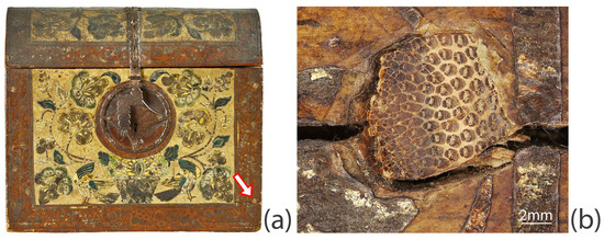 The casket is simply constructed: the sides of the box and lid are joined to the front, back and top with wooden nails (Figure 7). Tool marks relating to the construction are visible inside the casket; these include handsaw marks on the bottom and sides, scribe marks on the sides, and gouge marks on the lid. The front is fitted with a lock (the key is missing) and decorative escutcheon, while the lid has a decorative hasp and two ornate iron hinges at the back. By eye wood identification is limited as there are no uncoated areas of end grain. Based on the tangential wood grain pattern, and colour of the exposed interior wood, the timber features are consistent with Spanish cedar (Cedrela odorata), identified in other barniz de Pasto items [2,17,18,19]. To achieve a more informed wood identification, sampling would be required but is not recommended as it would impact the integrity of the casket. Examination of the wooden nails suggests they are all made from bamboo as bamboo’s distinctive pattern of vascular bundles and fibres are easily visible (Figure 7b).