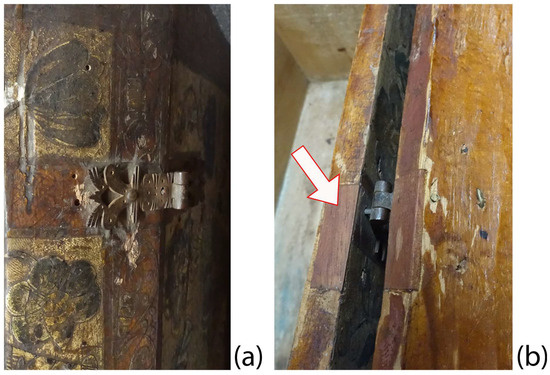 (a) The hinge on the proper right of the casket; (b) the altered area where wood fills coincide with both external hinges. The arrow marks the location of one of the wood fills.