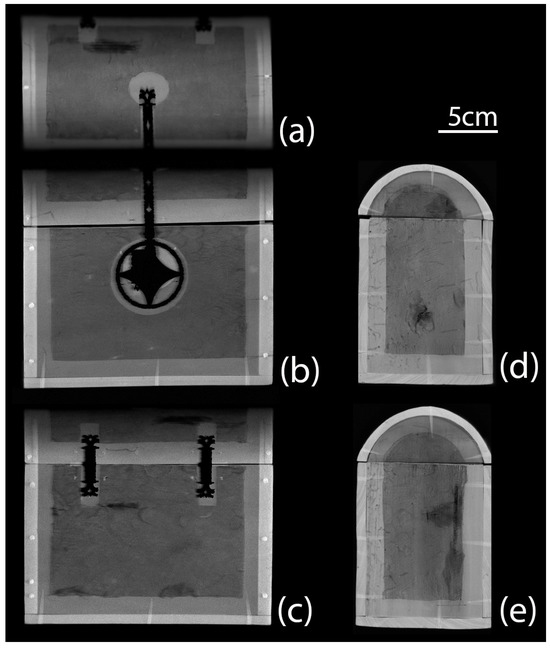 Figure 9 shows the distribution maps of elements in the Compton region (the high-energy region between 17 and 40 KeV), resulting in the observation of the materials constituting the body of the casket, and revealing details which are not visible to the naked eye. In this case, it is possible to view the wooden panels and how they are joined. The wooden nails can be seen clearly, as well as the marks left by other nails which are no longer present. The growth rings of the wood are also visible. It can be observed that the boards are mostly rift or radially cut, suggesting thoughtful craftsmanship—as radial grain orientation minimises the effect of wood movement due to relative humidity fluctuations [20,21]. The lid appears to be hollowed from a single board to obtain the desired curvature.