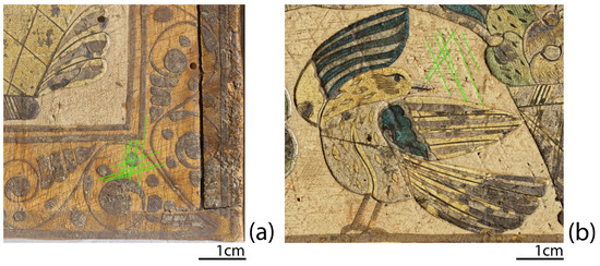 The cross-hatching marks scoring the wood substrate can be seen under raking light: as an example, see detail of (a) proper left side and (b) front of the casket. Green lines highlight some of the cross-hatching marks.