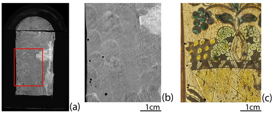 The XRF scans also show clearly the damage associated with furniture beetle activity and the resulting tunnels. Lastly, tool marks left on the outer wood surface, before the application of the decorative finishes, can be observed. The cross-hatching pattern scored on the wood surface after the assembling of the casket suggests an attempt to increase the adhesion between the substrate and the decorative coatings (Figure 10).