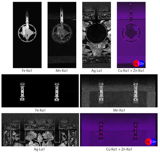 XRF distribution maps of iron (Fe), manganese (Mn), silver (Ag) and copper (Cu) with zinc (Zn). The silver maps confirm that no silver is present on the metal components, and the copper and zinc maps show that the nails holding the lock and hinges in place are made of brass. Traces of brass from nails used for previous locks and hinges can also be seen, suggesting the outline of previous hardware.