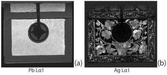 XRF distribution maps of (a) lead (Pb) and (b) silver (Ag) for the front of the cabinet.