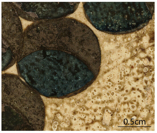 It is worthwhile noting that the lead-containing layer presents many impurities and small bubbles (Figure 15), but despite this, the lacquer is still well attached to the wood. The origin of the bubbles is uncertain; they could be due to the imperfect purification and preparation of the mopa mopa sheet, but also to the formation over time of lead soaps, which are known to have a disruptive effect on the appearance and integrity of lead-pigmented layers [23,24,25,26,27].