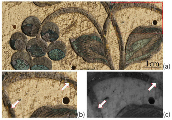 Figure 16a shows a detail of the casket viewed under raking light, revealing how the decoration was applied on top of the lead-containing background. Parts of the preparatory underdrawing show, in visible light, under the metal leaf where the latter has been lost (Figure 16b), but it becomes transparent when viewed under infrared light (Figure 16c).