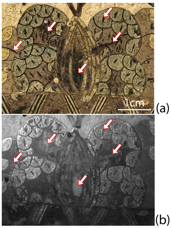 The artist also used an alternative method to enhance the outline of some of the details on the casket, as shown in Figure 19. The lines marked by red arrows refer to details which are dark under both visible (Figure 19a) and infrared (Figure 19b) illumination, suggesting that they likely contain carbon black, finely ground and applied on the incisions of the mopa mopa layers.