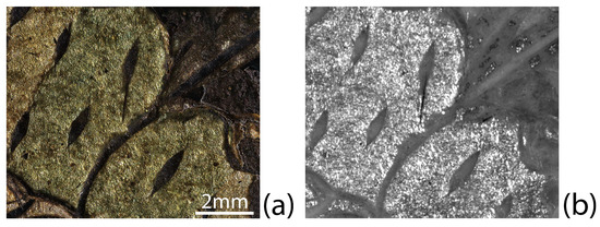 IRR was conducted with an Apollo IR Camera (Opus Instruments, UK) sensitive to the near IR wavelengths from 900 to 1700 nm. The camera is equipped with an InGaAs line array sensor, with an area of 125 × 125 px. Images were acquired with a focal aperture of F11 and a focal length of 150 mm. Two tungsten lamps were positioned symmetrically at ~45° with respect to the focal axis of the camera. A 1250 nm Short Wave Pass filter (SWP), a 1250–1510 nm Bandpass filter (BP) and a 1510 nm Long Wave Pass filter (LWP) were also used. Macro IRR images were acquired with a macro lens with a focal aperture of F4.5.