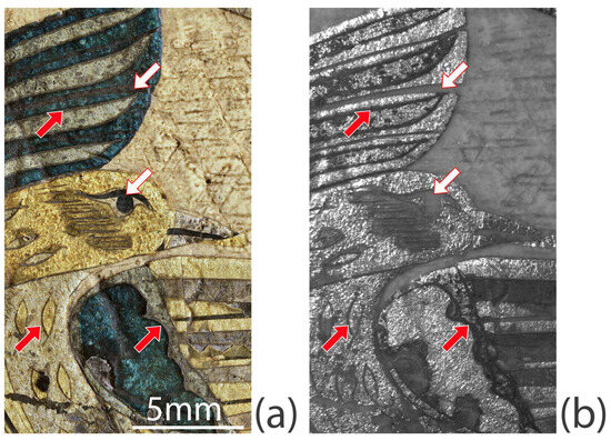 Detail of the proper left of the casket, with arrows marking the dark-coloured layer underneath the silver leaf: (a) visible image and (b) IRR image.