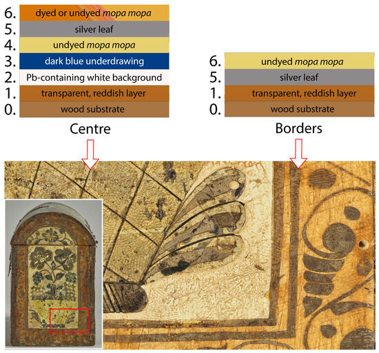 The layer structure is complex, and varies depending on which part of the casket is considered. The initial mopa mopa layer seen on the borders, some of the interior and under the base of the casket is a transparent reddish colour. The centre of the wooden panels has an opaque ivory-coloured layer of mopa mopa, used as a base and background for the barniz brillante decoration. This layer has a high concentration of lead and was probably coloured with lead white (albayalde). Occasionally, a dark layer, which can be described as an underdrawing, is also seen. Silver leaf is then applied where the decorative scheme requires it, and is covered by additional layers of mopa mopa. These protect the silver leaf from tarnishing but are also used decoratively, with some areas coloured in different shades of green, blue and yellow to create a vibrant brillante surface. The overlapping layers create a distinctive textured relief on the surface.